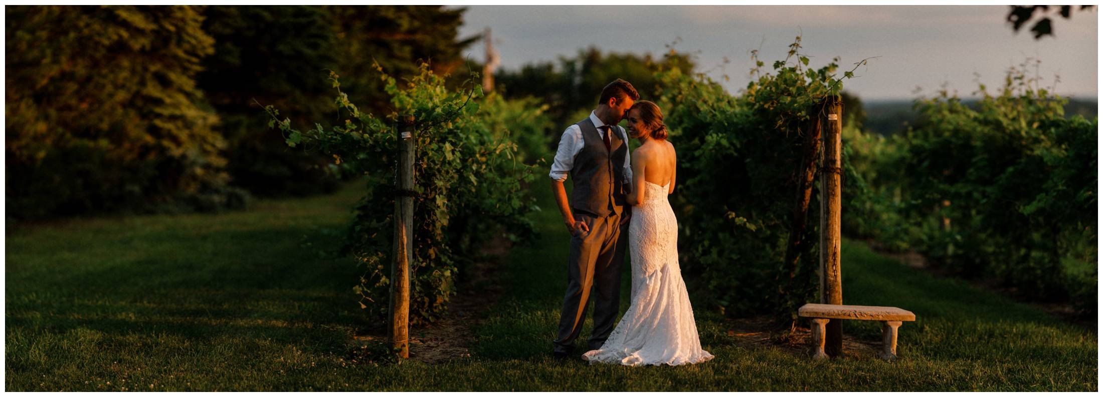 We love scheduling in a little window of time to sneak out for portraits during the reception. It allows us to capture some of the more intimate, romantic portraits beyond the the typical smiling at the camera ones earlier in the day. Bonus points when Northern Michigan gives us a night like this one with cotton candy clouds and the sun setting over the vineyard.