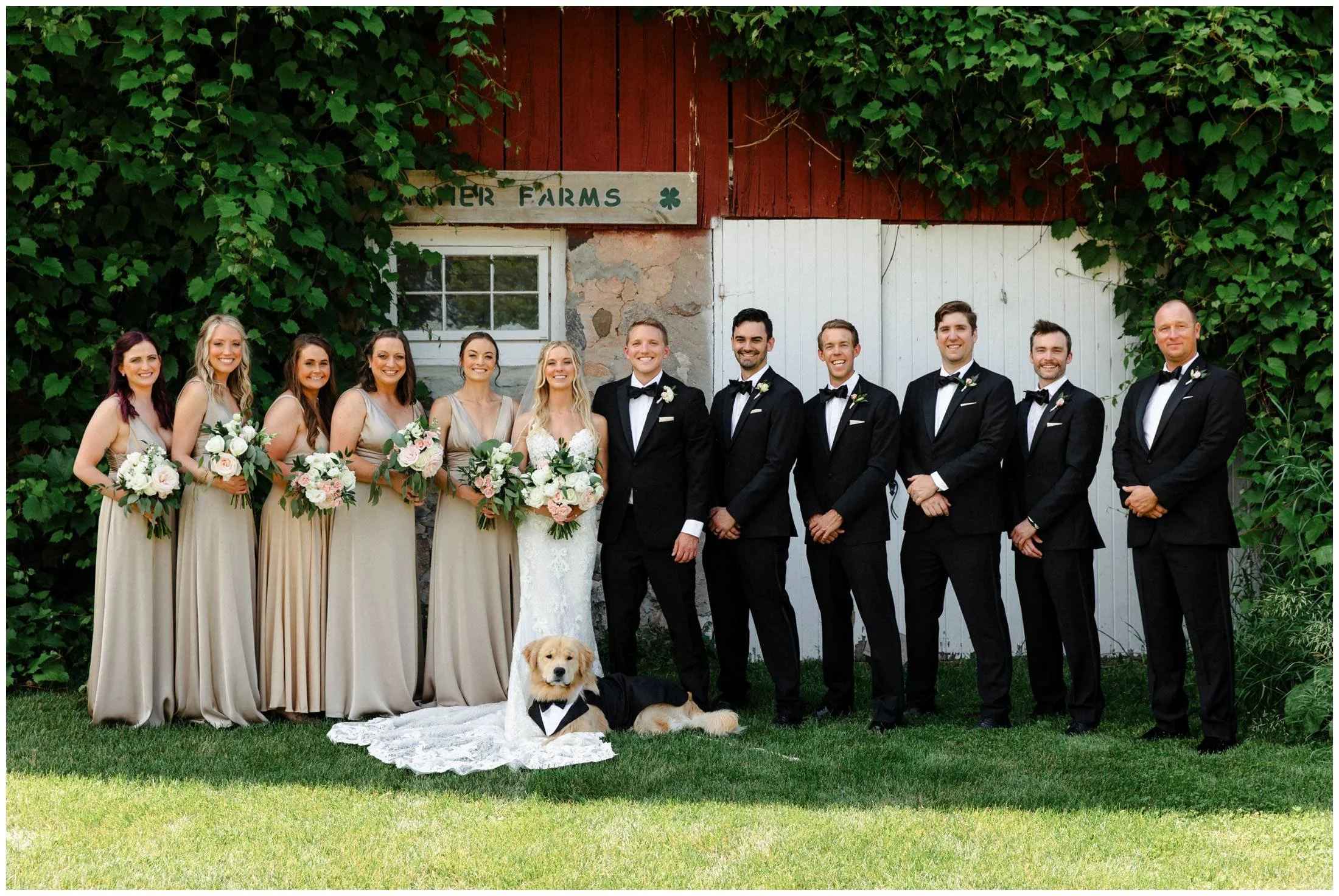 Joel and Emily were married in the prime of the Northern Michigan summer season. With Blue Angel Jets flying overhead for the airshow during cherry festival, Joel and Emily got ready at their respective locations on site. The orchards of Bayview Weddings at Gallagher Farms boasted of red ripe cherries. It was here amongst the trees that Emily approached her father for their first look and again once more amongst the cherries to meet her Groom for their intimate first look and private vows. After their emotional vows, Emily got ready for another very special first look—this time with their dog, Finley. Finley also played the very important role of ring bearer and when the time approached, he raced down the ceremony aisle to Joel and Emily. They exchanged rings overlooking the stunning Lake Michigan view and eventually made their way back to the open lawn and tented reception area to continue the festivities with their friends and family.